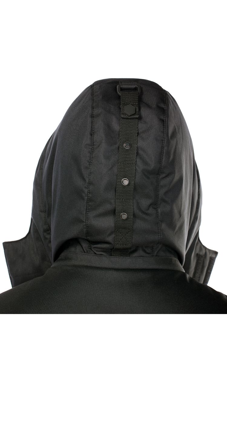 Капюшон съемный, на молнии, с двойной регулировкой объема по лицевому вырезу и по затылочной части на тесьму и кнопки.