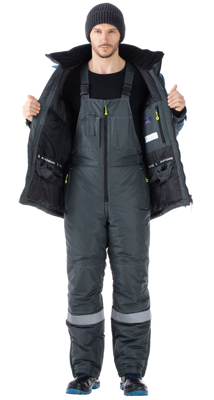 Костюм мужской утепленный, состоит из куртки и полукомбинезона из плотной курточной ткани с водоотталкивающими и ветрозащитными свойствами.