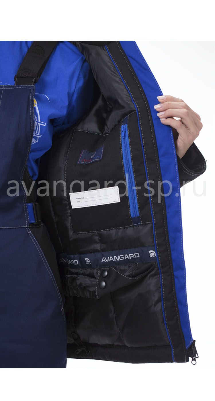 На куртке и по низу полукомбинезона – широкие световозвращающие полосы для работы в условиях плохой видимости.