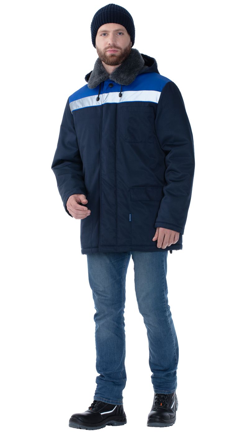 Куртка мужская утепленная с контрастной кокеткой, с кулисой по талии для регулировки объема. Супатная центальная застежка на пуговицах. Воротник отложной с искусственным мехом.