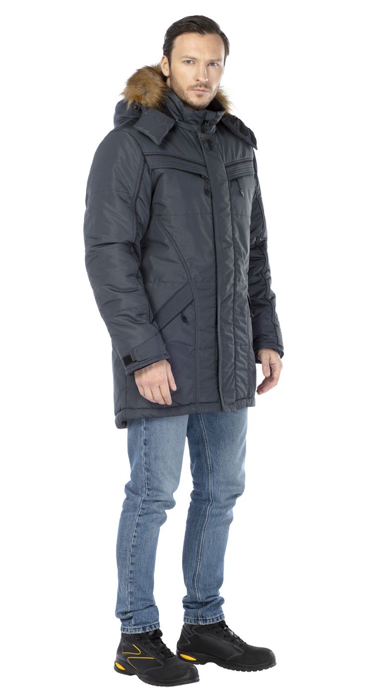 Капюшон съемный, на молнии, с двойной регулировкой объема по лицевому вырезу и по затылочной части. Съемная опушка на капюшоне из искусственного меха.