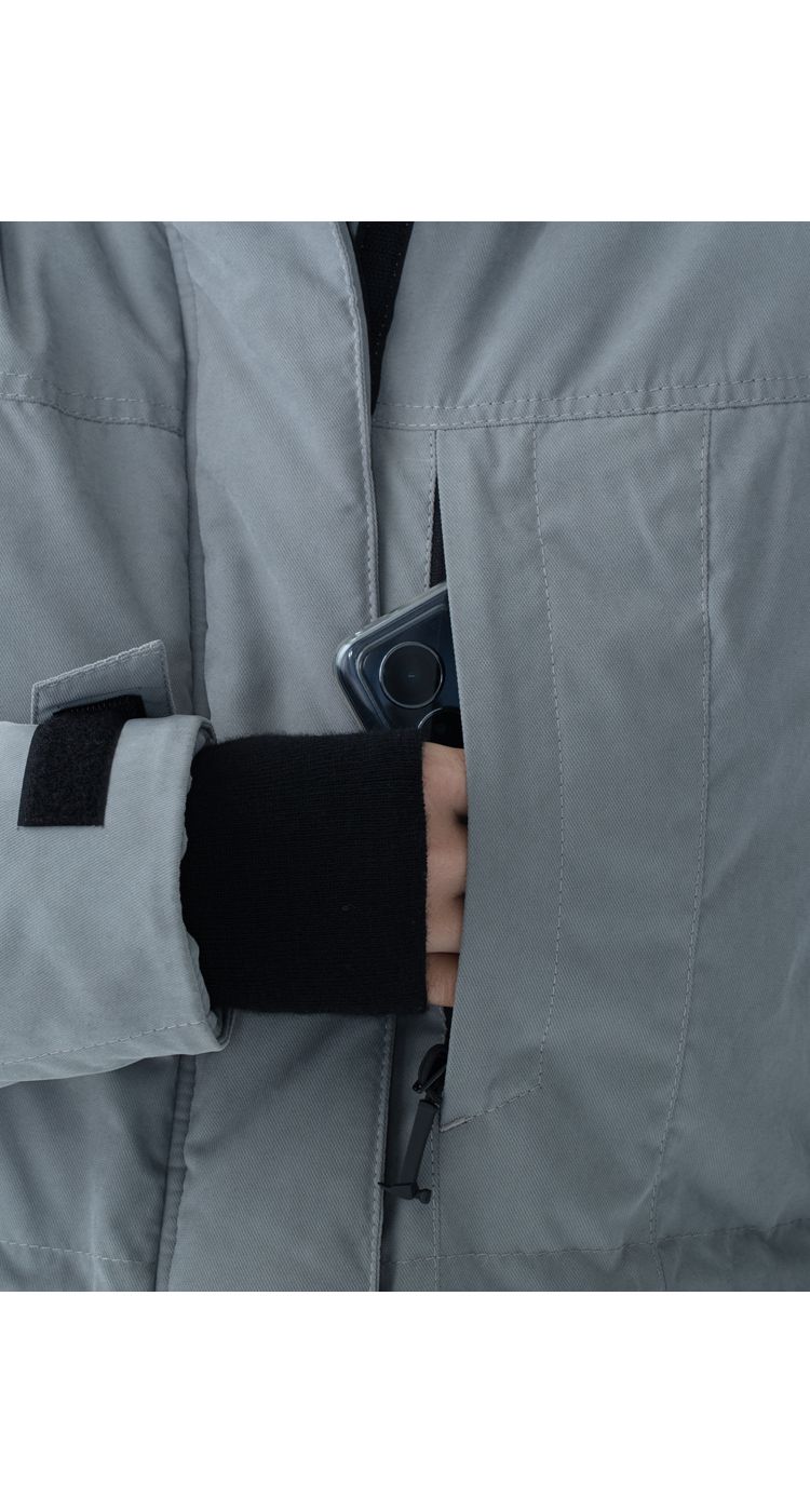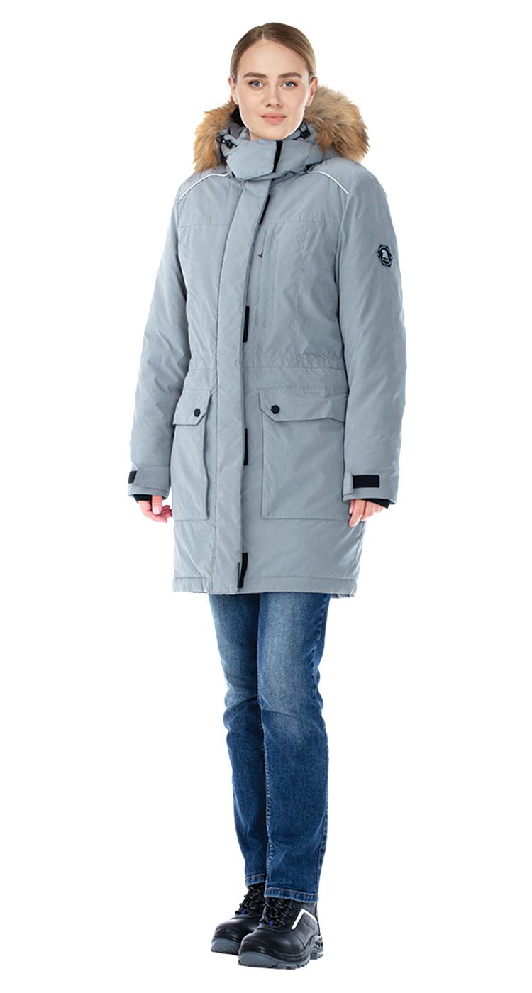 Куртка удлиненная, с центральной застежкой на двухзамковую молнию под ветрозащитной планкой на липучках.