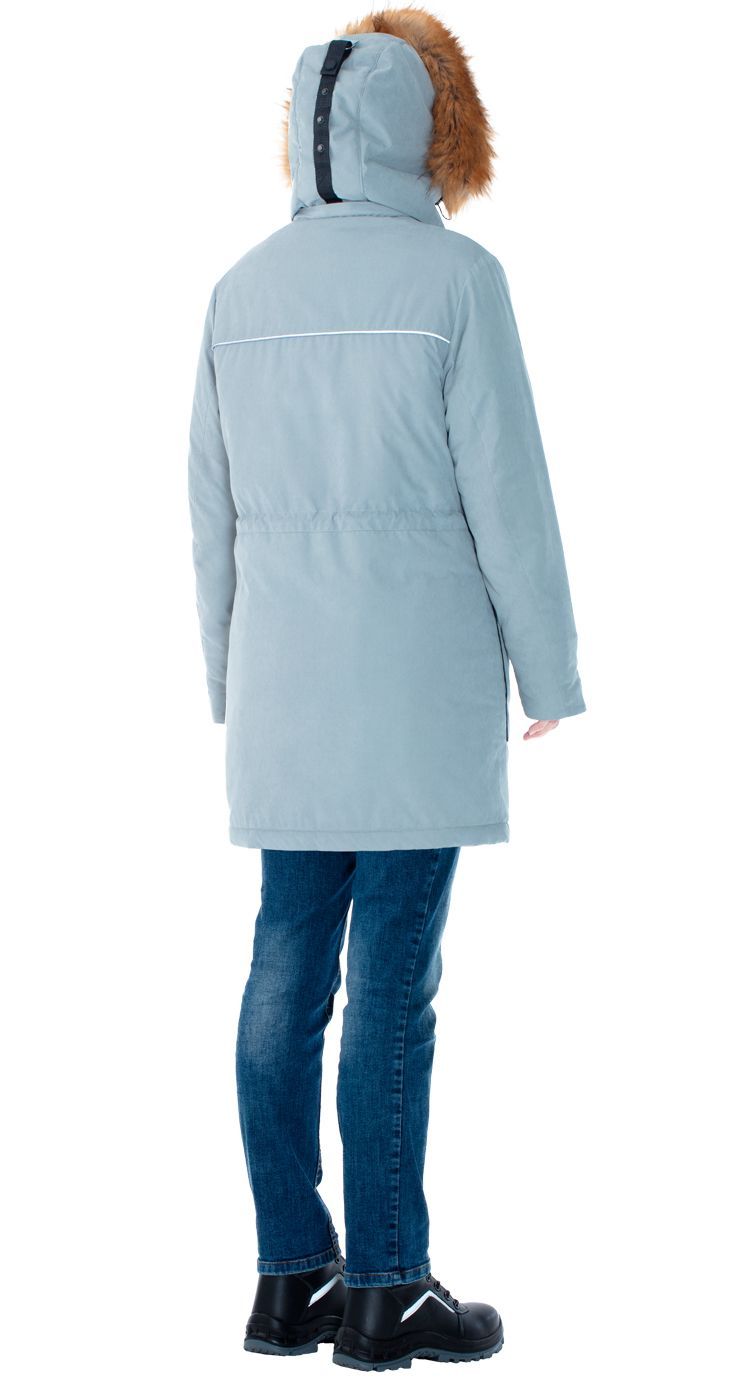 Капюшон съемный, на молнии, с двойной регулировкой объема по лицевому вырезу и по затылочной части на тесьму и кнопки. Съемная опушка на капюшоне из искусственного меха. Возможность увеличить глубину капюшона за счет отворота для защиты от метели и ветра.