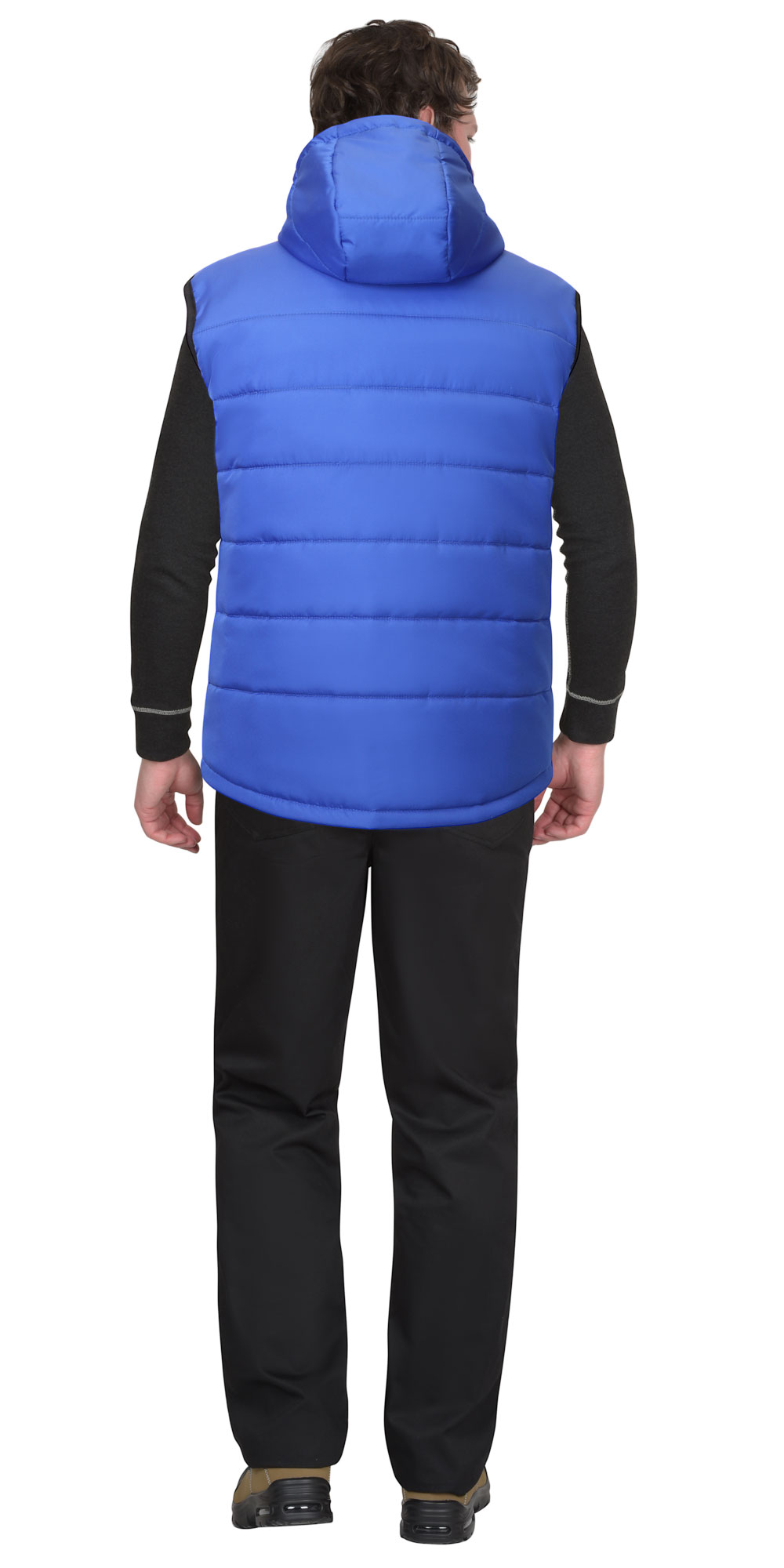 Жилет утеплённый, выстеган с утеплителем горизонтальными строчками, на подкладке, с втачным капюшоном, с застёжкой на молнию, закрытую ветрозащитным клапаном от края капюшона до низа изделия, застёгивающимся на кнопки. Жилет с одним нагрудным карманом с молнией и двумя нижними карманами. Спинка жилета, удлинённая с фигурной линией низа. Пройма окантована резинкой. Объём капюшона по лицевому вырезу регулируется шнуром с фиксаторами.