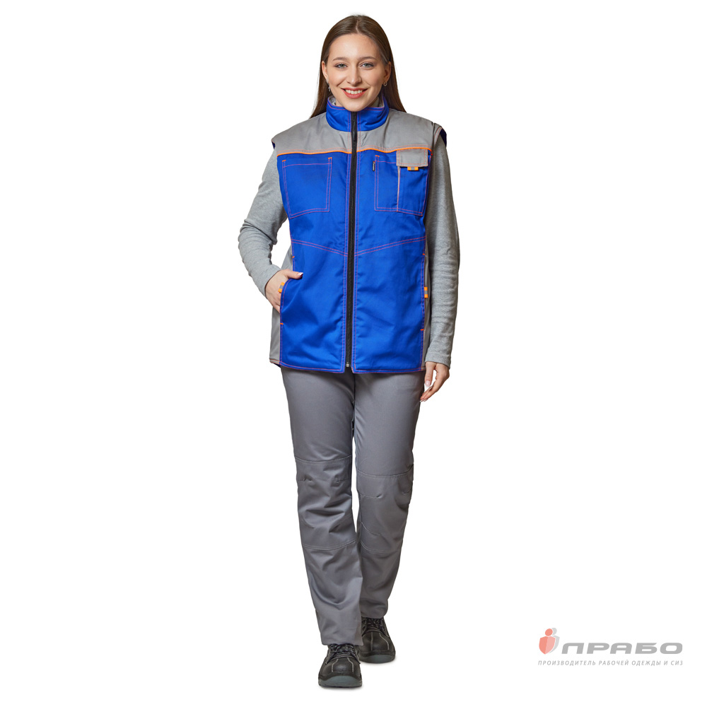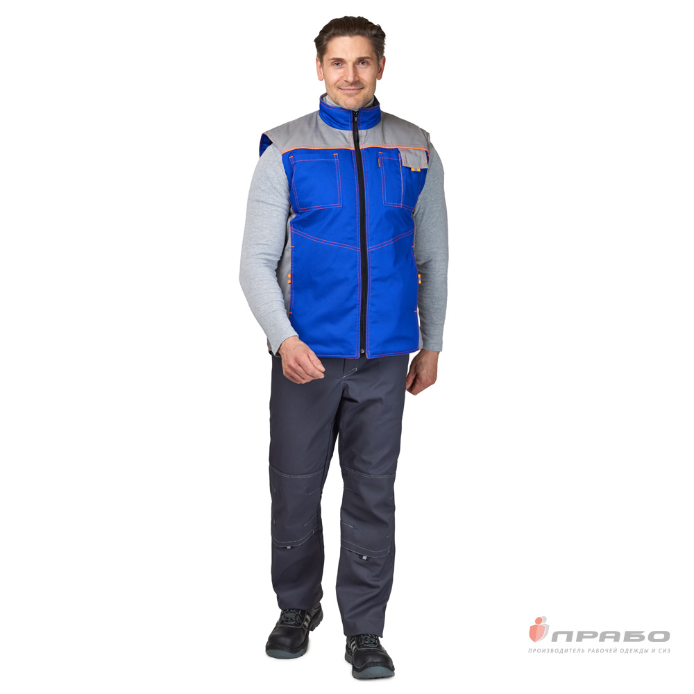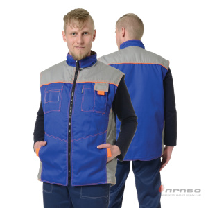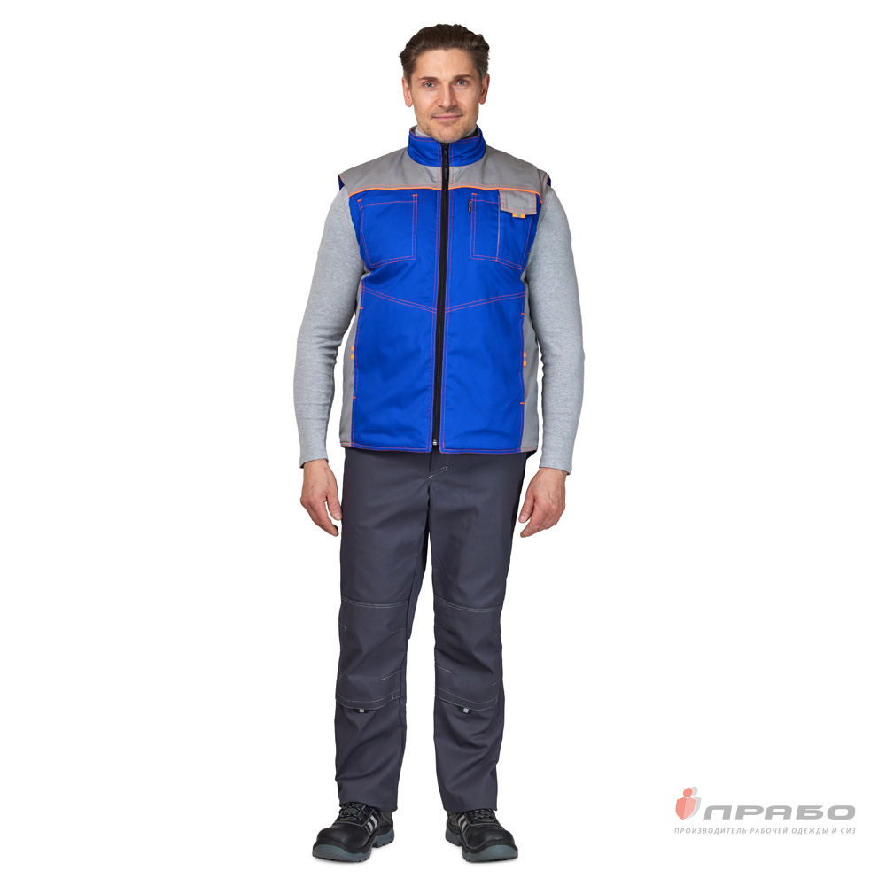 • выполнен из ткани двух цветов - серого и василькового, с ярким кантом и отделочными патами на карманах;