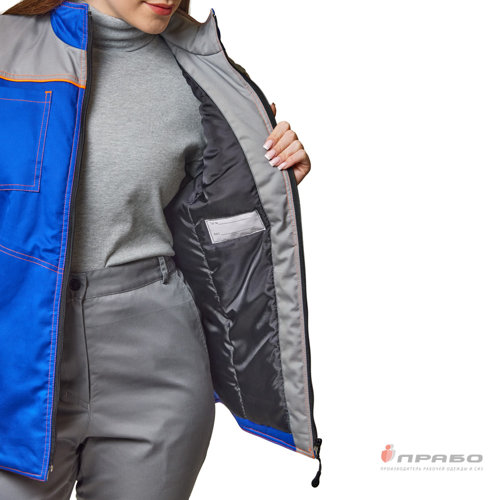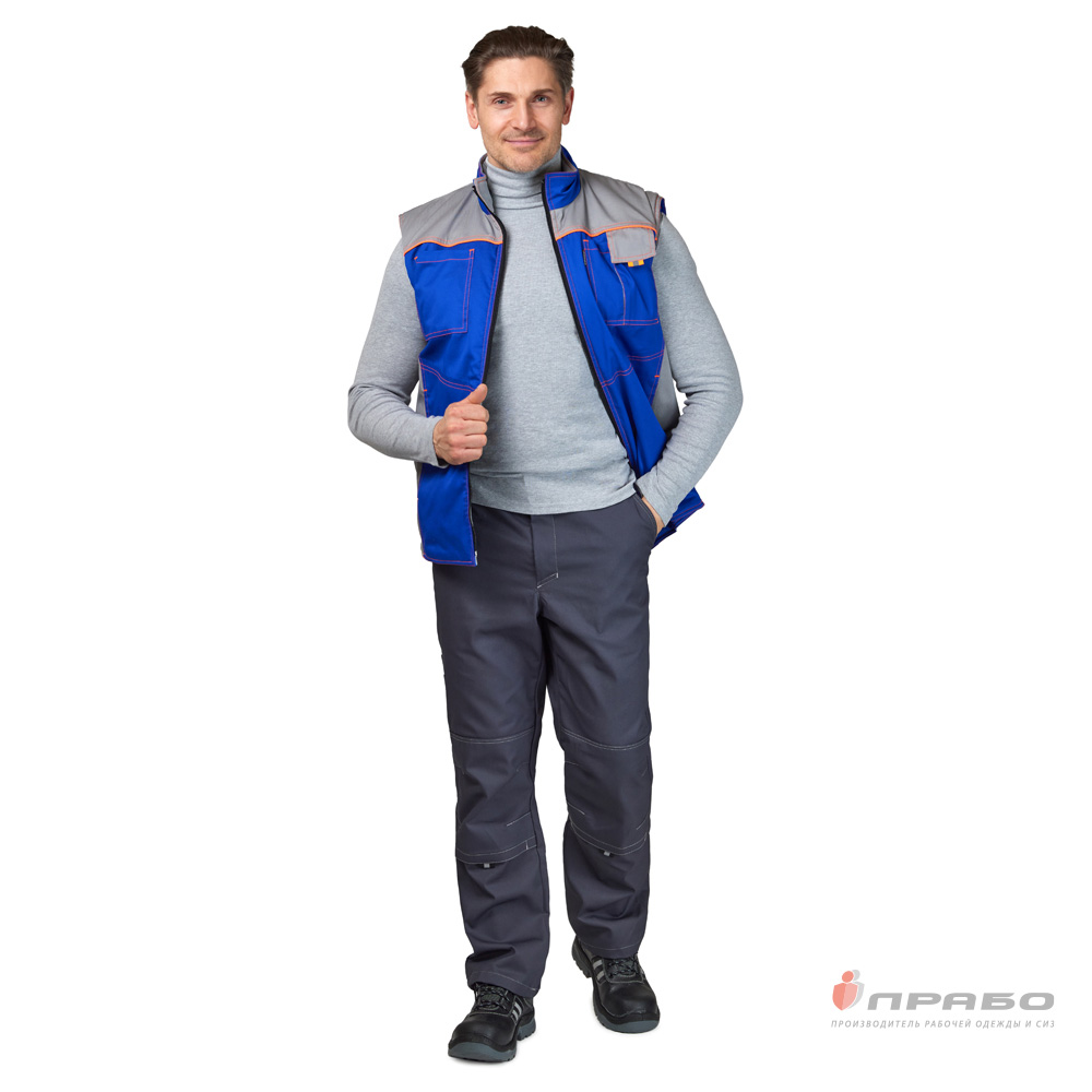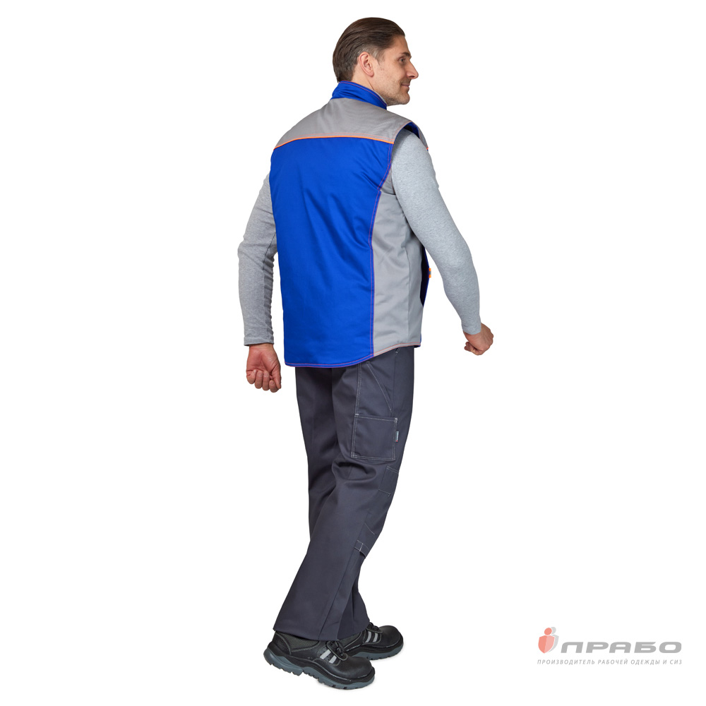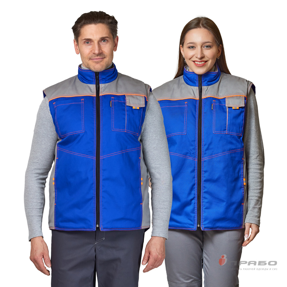 • выполнен из ткани двух цветов - серого и василькового, с ярким кантом и отделочными патами на карманах;