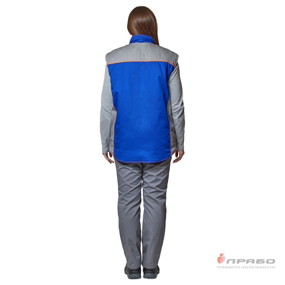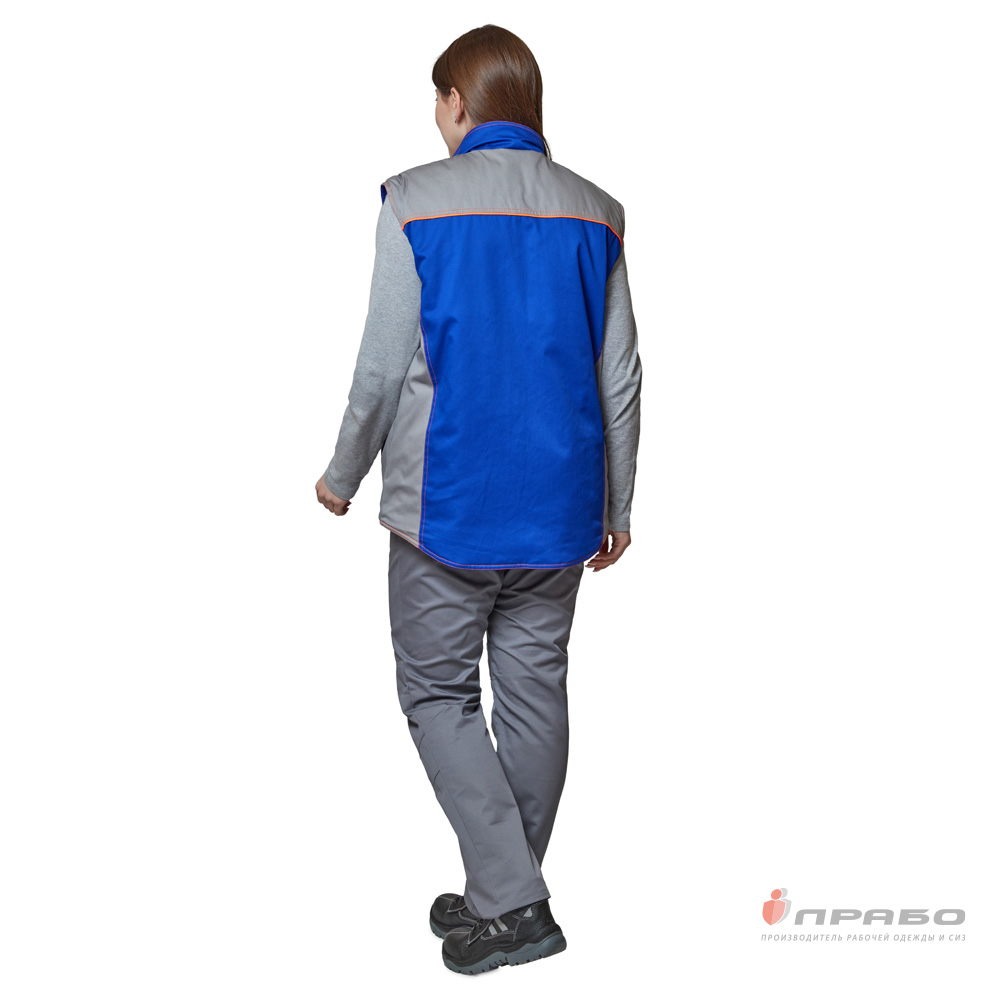 Жилет: утеплённый прямого силуэта, с центральной застёжкой на тесьму «молнию». Полочка состоит из трёх частей: центральная часть из ткани основного цвета, кокетки и боковые части из отделочной ткани. Спинка жилета удлинённая, фигурная. Воротник–стойка утеплённый. Утепляющая подкладка жилета стёганная вертикальными строчками. На левой полочке подкладки настрочена лента ФИО.