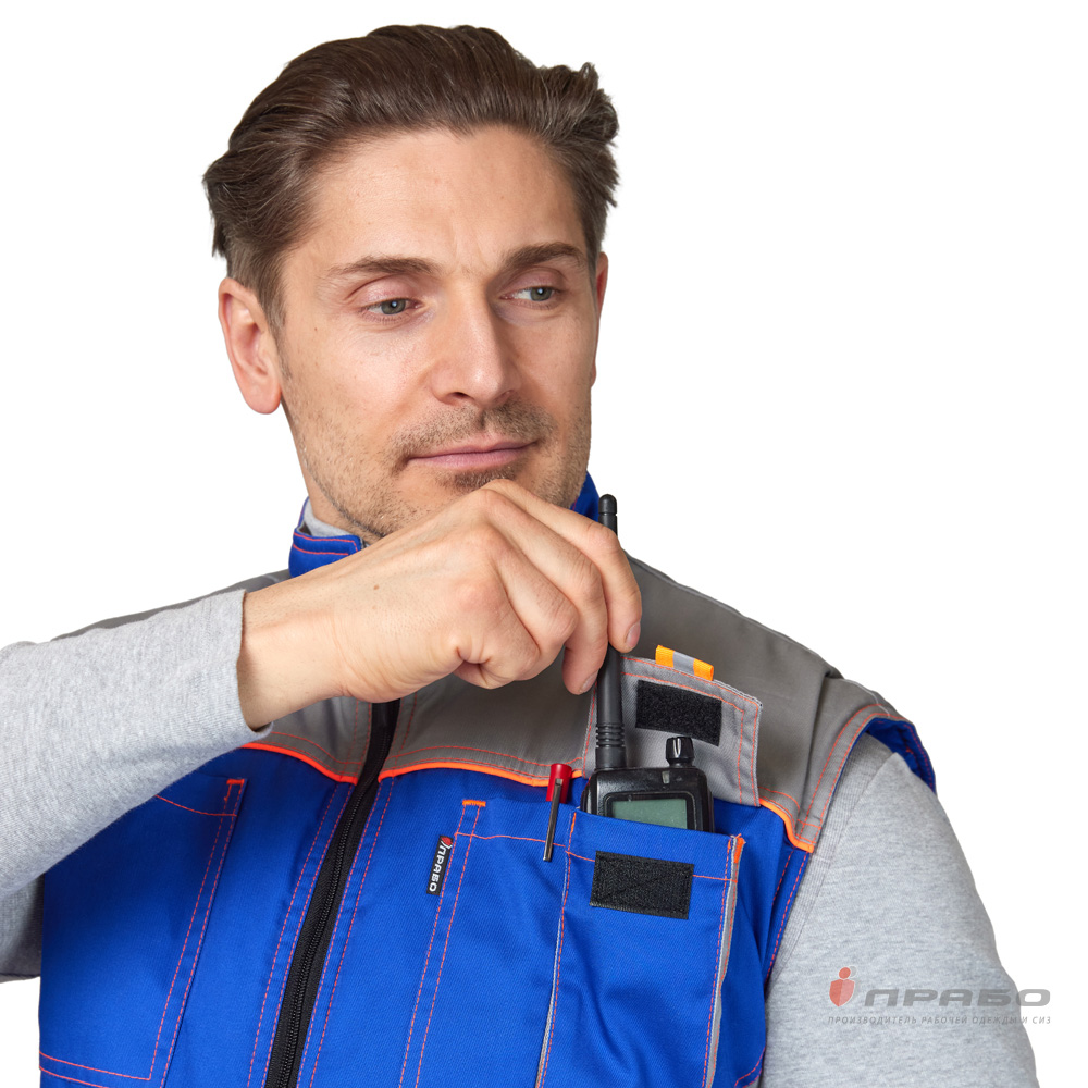 Карманы: нагрудные накладные на правой и левой полочке, на левой полочке нагрудный карман состоит из двух отделений, одно из отделений - накладной объёмный карман для мобильного телефона. Карман с клапаном из ткани отделочного цвета с декоративным флажком из ранцевой ленты с СОП посередине длиной 1,0 см, с застёжкой клапана на контактную ленту. Объём кармана за счет складки из ткани отделочного цвета. В боковых частях полочек карманы с вертикальным входом. По входу в карман флажок из ленты ранцевой длинной 10 мм. Размер входа в карман ограничен закрепками.
