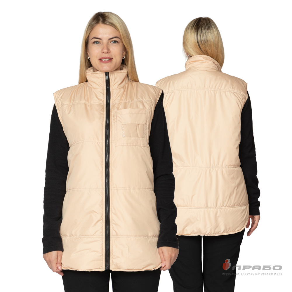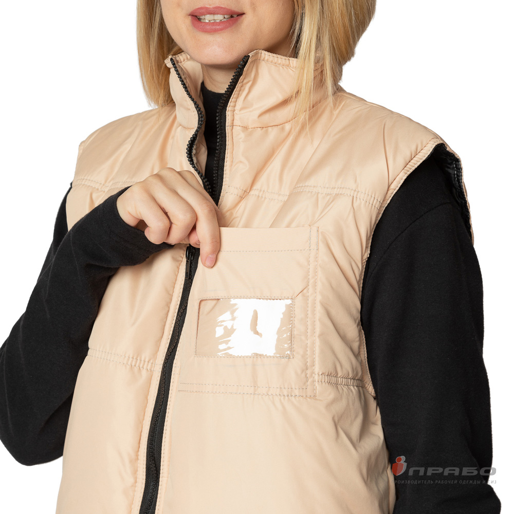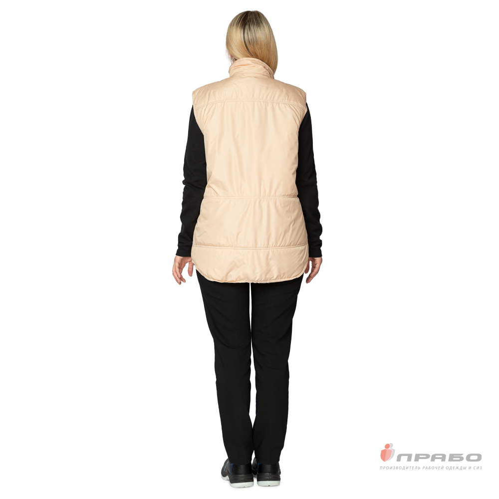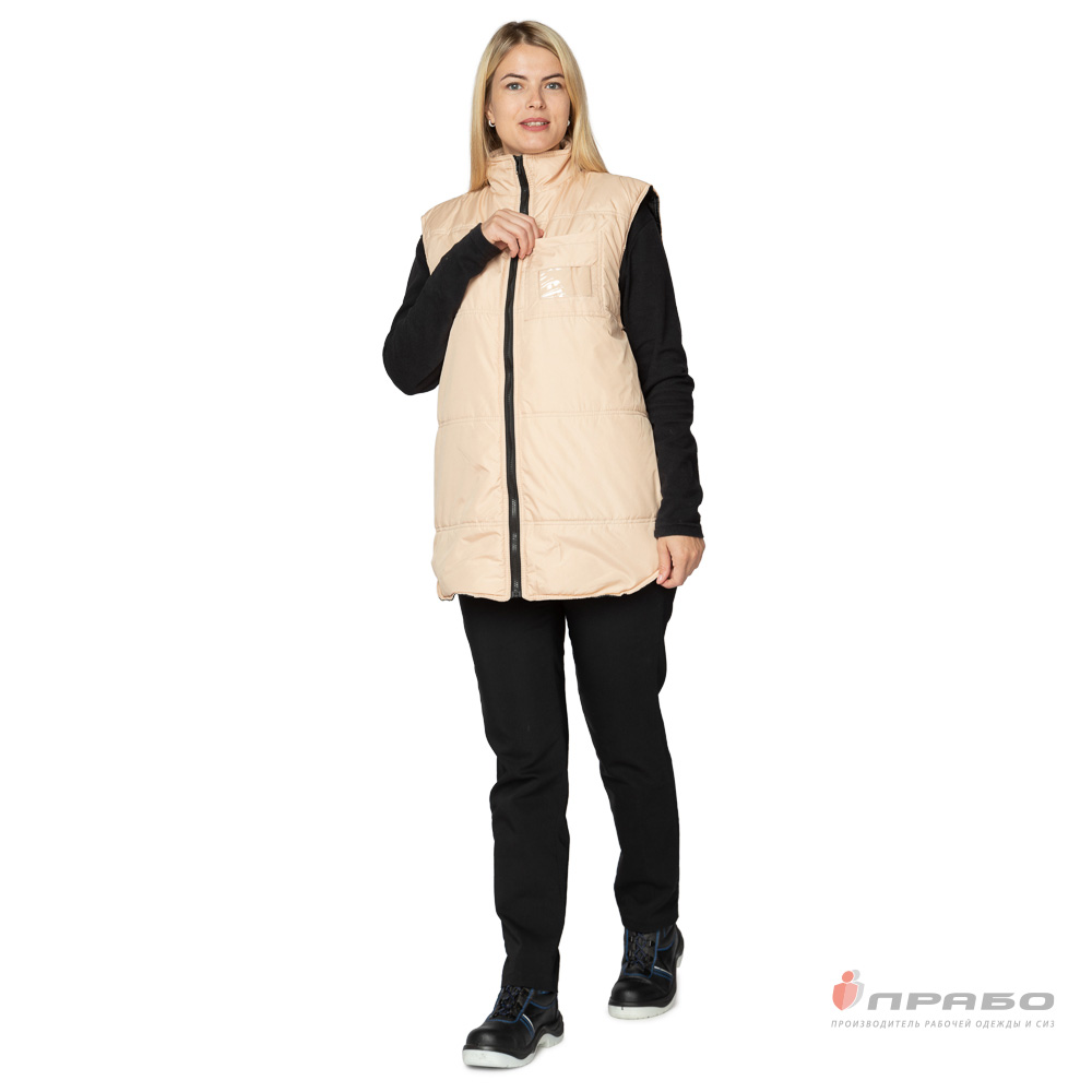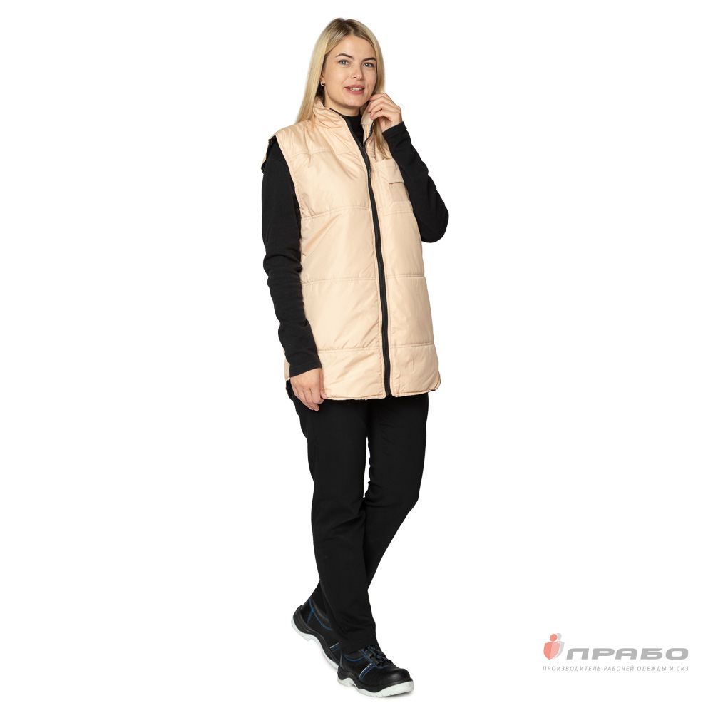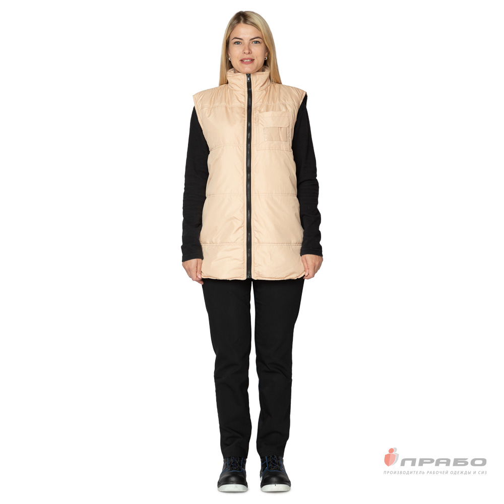 Жилет: утеплённый, прямого силуэта с горизонтальной стёжкой по полочкам и спинке, с центральной застёжкой на молнию. Спинка жилета удлинённая с фигурной линией низа. Воротник-стойка.